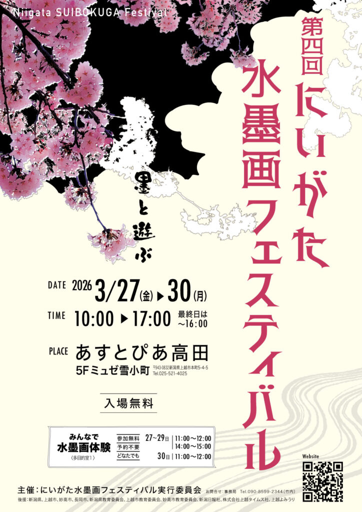 2023 年に新潟県上越市で第 1 回を開催いたしました「にいがた水墨画フェスティバル」も、多くの皆様のご支援とご参加により回を重ね、2026 年には第 4 回目を迎えることとなりました。これまで上越市内をはじめ、新潟県各地、関東、長野方面から特色ある作品をお寄せいただき、水墨画の新しい可能性を感じる場として大変好評をいただいております。