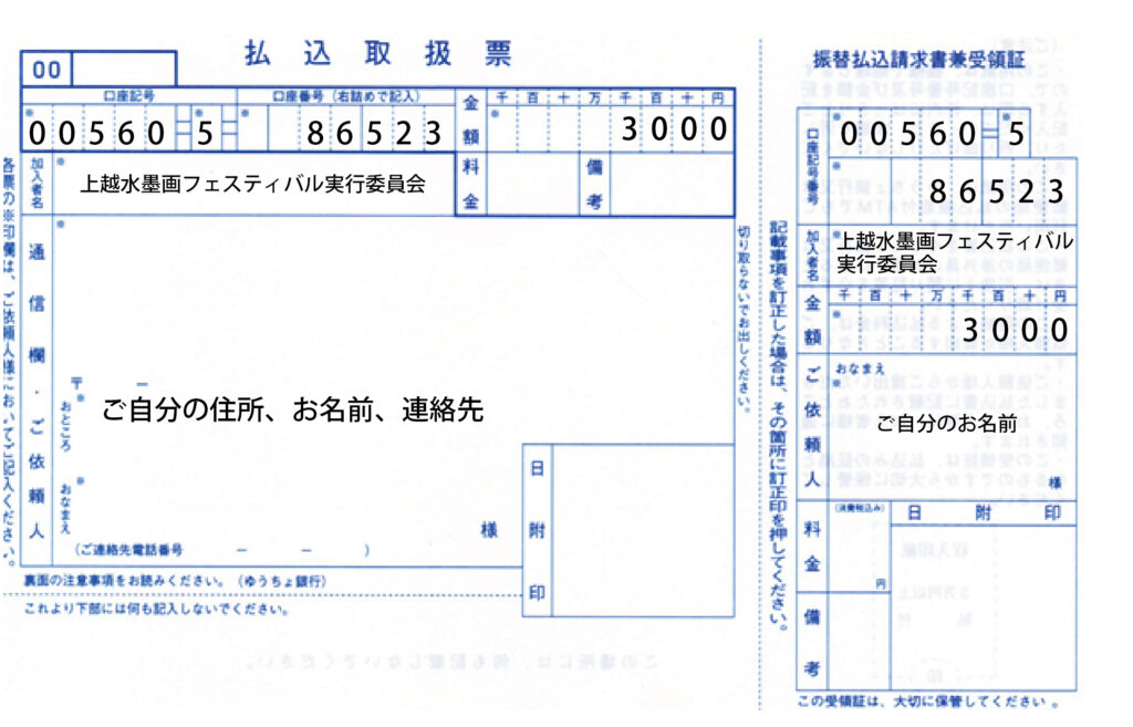 郵便局の払込取扱票で、下記のように記入し、お振込みください。