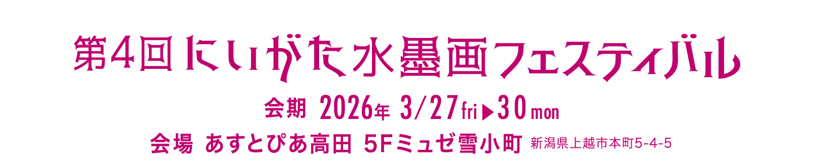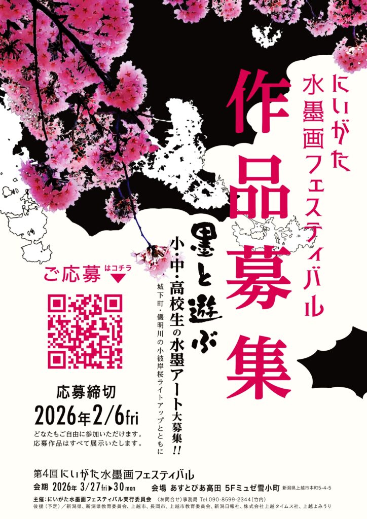 2023 年に新潟県上越市で第 1 回を開催いたしました「にいがた水墨画フェスティバル」も、多くの皆様のご支援とご参加により回を重ね、2026 年には第 4 回目を迎えることとなりました。これまで上越市内をはじめ、新潟県各地、関東、長野方面から特色ある作品をお寄せいただき、水墨画の新しい可能性を感じる場として大変好評をいただいております。